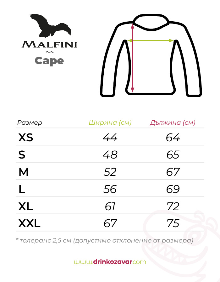 Новият модел дамски суитчър, Cape на Malfini, е с леко вталена кройка, която седи свободно по тялото. Дамският суитчър е изработен от качествена материя (French terry), която е мека, топла и издръжлива.