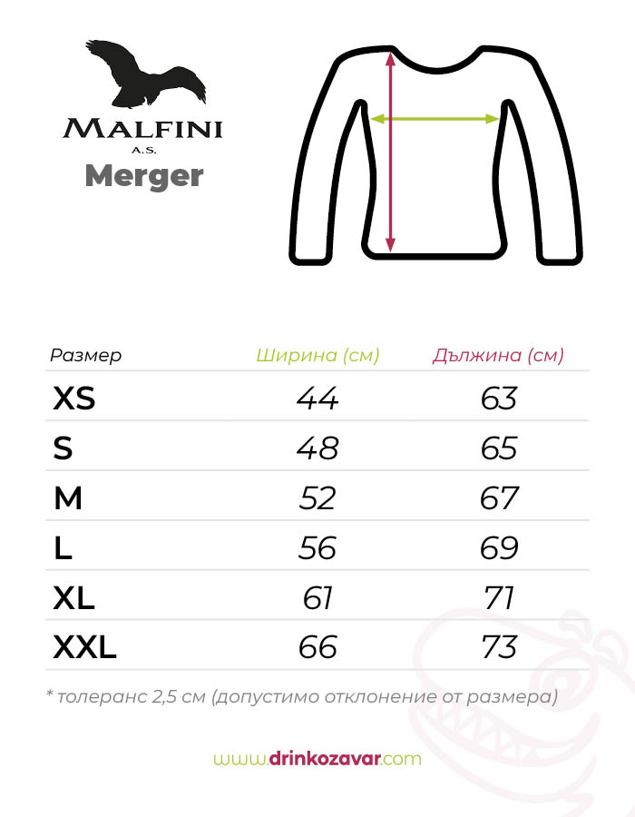 Моделът Merger, на Malfini, представлява плътна дамска блуза с вталена кройка и реглан ръкав. Благодарение на материята, от която е изработена (French terry) блузата е подходяща за целогодишна употреба. През студените месеци държи топло, а през топлите предпазва тялото от изпотяване.