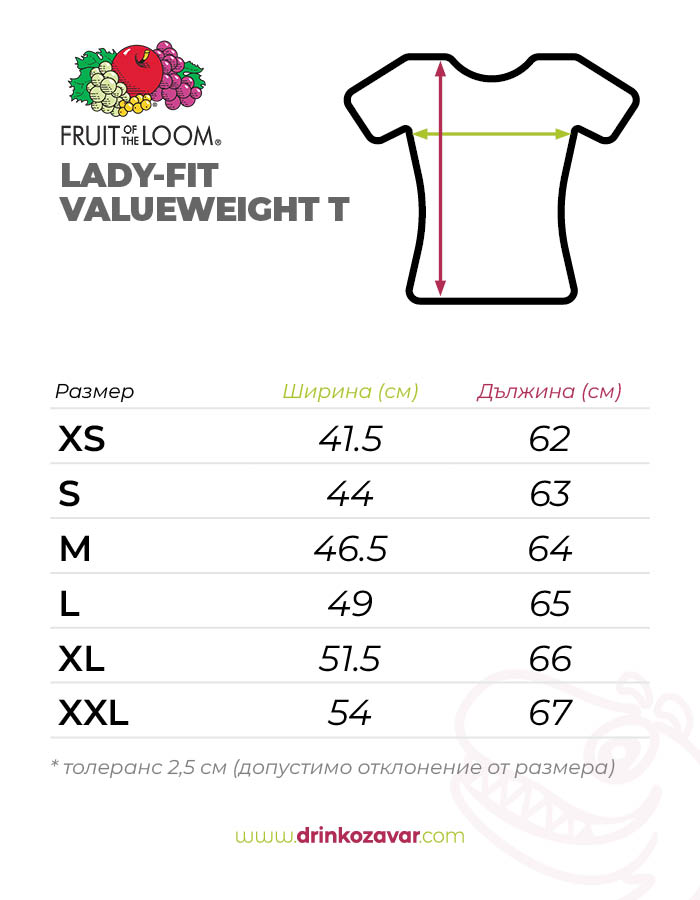 Най-разпространеният модел дамска тениска с къс ръкав на Fruit of The Loom. Предлагат се още мъжки и детски модели.