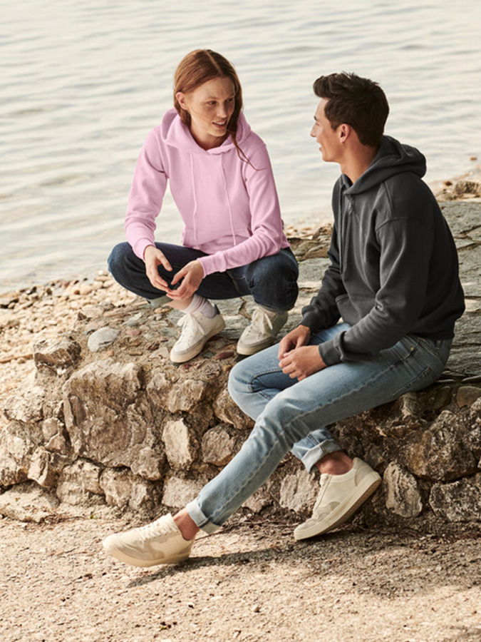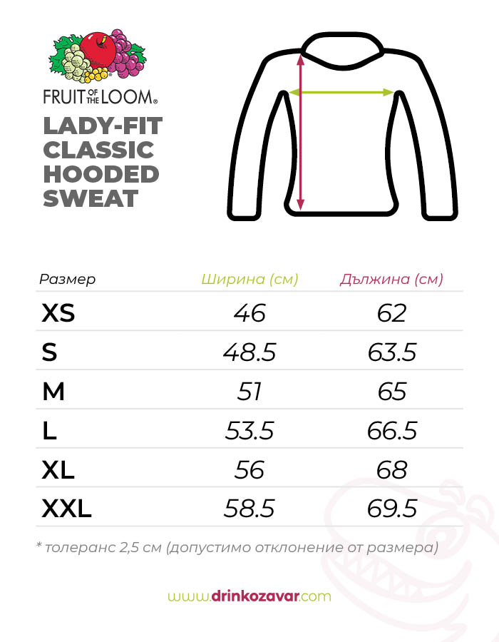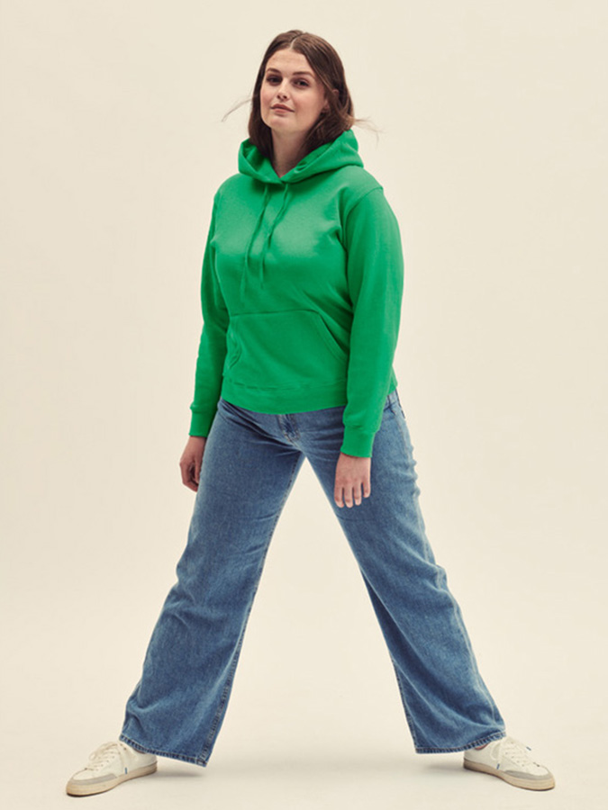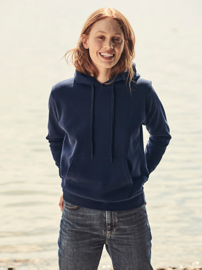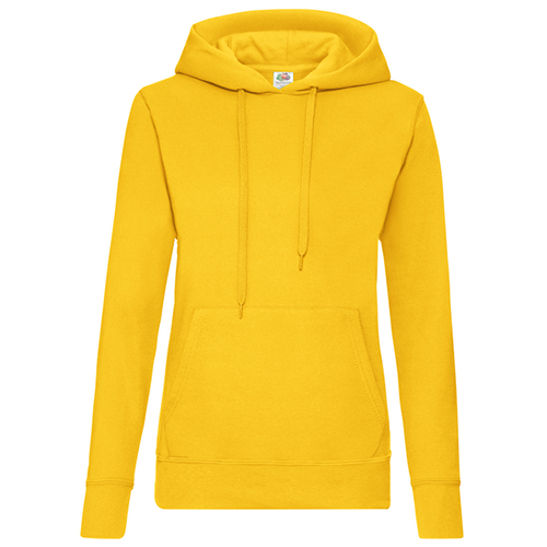 Дамски суитчър с джоб и качулка на Fruit of the Loom от серията Classic. Дамският модел е с вталена кройка и се предлага в разнообразие от цветове.